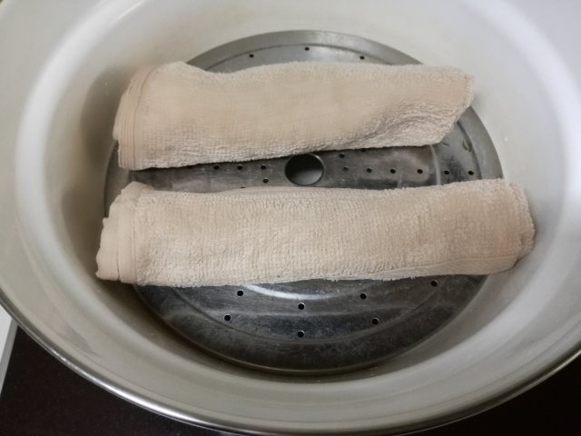 蒸しあがったら、1枚取り出して(この時、熱いので火傷に注意!)、1枚蒸し器に放置。